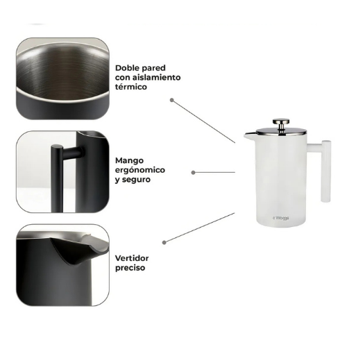 La Cafetera Francesa Térmica WAGGS combina el diseño clásico con materiales de alta calidad para que disfrutes de un café o té con aroma y temperatura perfectos por más tiempo.