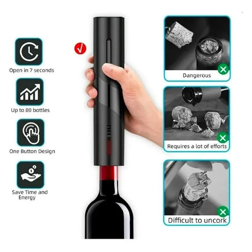 Disfrutá de tus vinos favoritos con estilo y sin esfuerzo 🍇. Este sacacorchos eléctrico automático combina diseño sofisticado y funcionalidad, convirtiéndose en el accesorio ideal para tu cocina o bar.